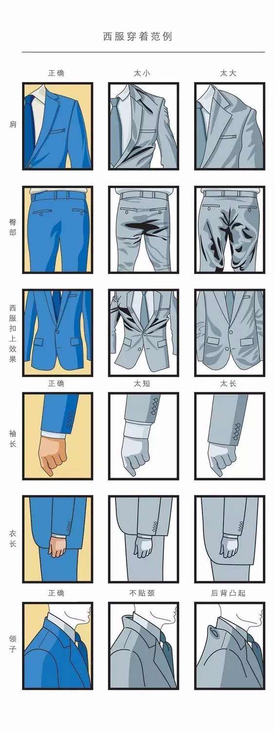 因此,西裝最重要的就是合體,不合體的西裝帶給你的只有缺乏品位和不專業(yè)。因此一套合適的西裝應(yīng)該如下圖所示: